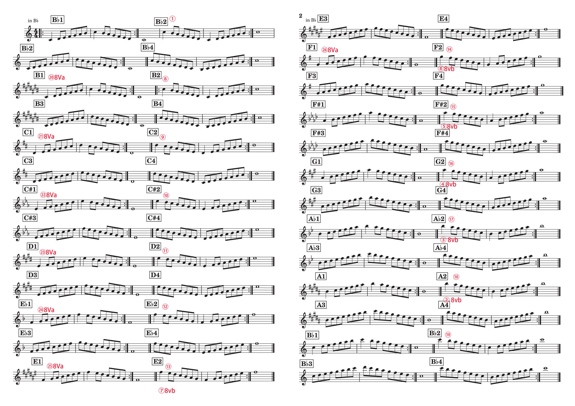 step2...音階を上がり、楽器をつけたまま息をとめ、再アタックして音階を下る。
